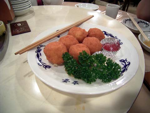 私の大好物でした。団子の中には、何かの野菜(筍だかクワイだか??)も刻んで入れられていたようです。外には長ネギのみじん切りも見えますが、揚げるときに一緒にネギも入れていたのでしょうか。これらにより、エビの臭みは全くなく、香ばしかったです。